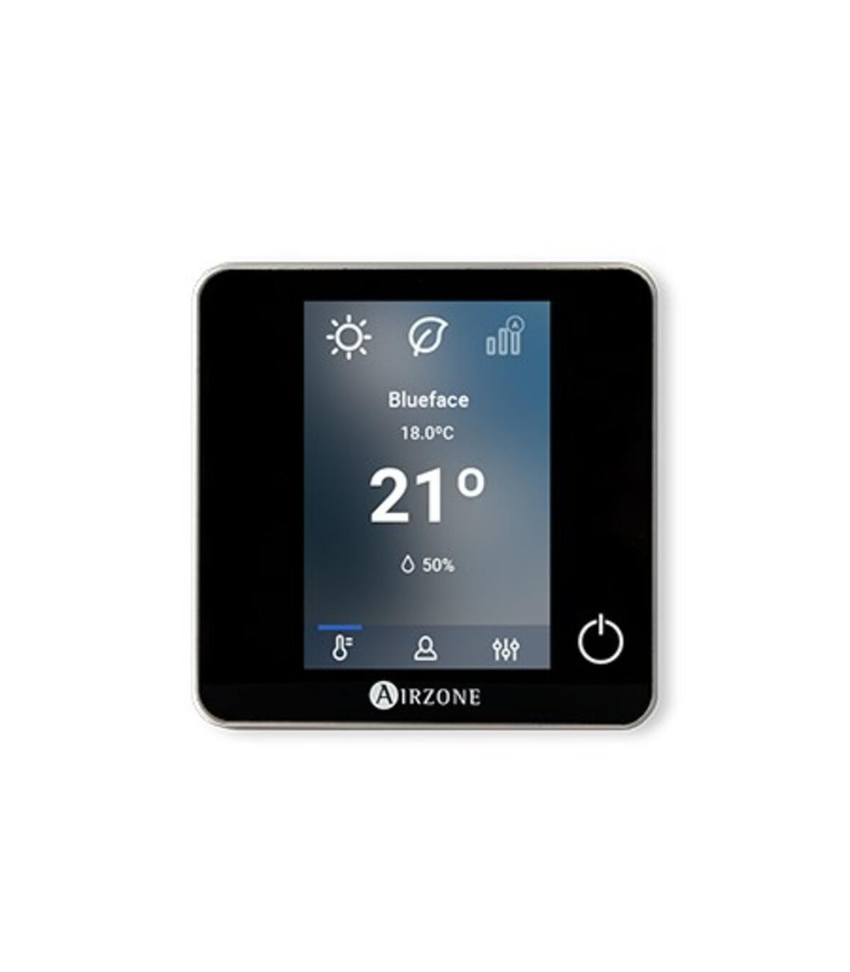 Interface graphique couleur avec écran capacitif et finition acier et verre, pour le contrôle de zone dans un système Airzone. Alimentée par l'unité centrale du système. Disponible en noir et blanc.