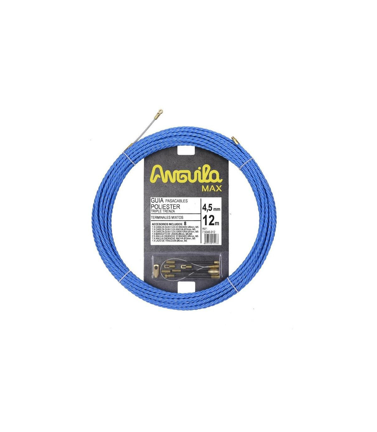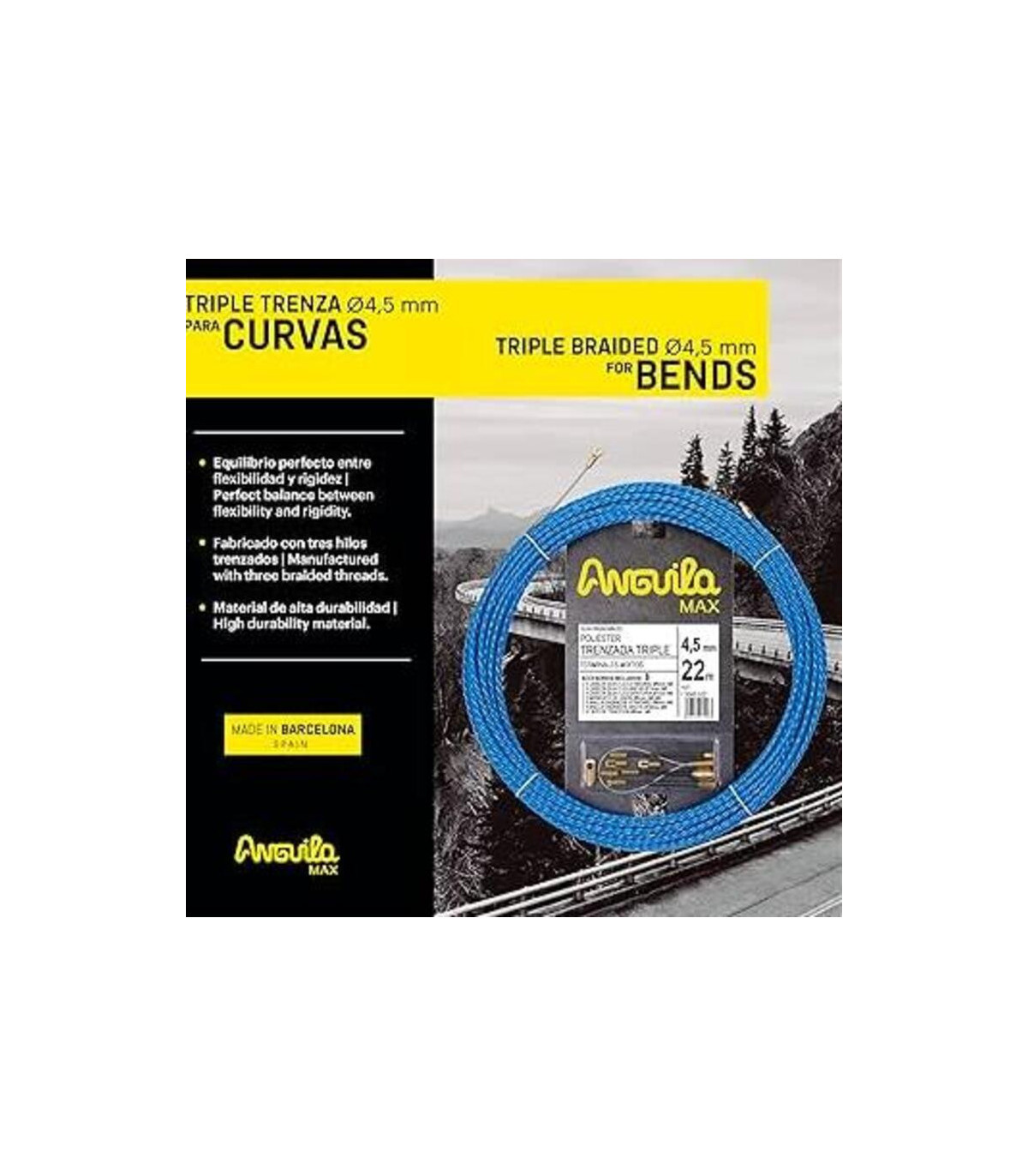 Tire-câbles en polyester tressé, diamètre 4,5 mm, longueur 12 mètres, bleu, fourni avec embouts mixtes et accessoires inclus : tête de tirage flexible de 6 mm de diamètre, tête de tirage ultra-flexible de 13 mm de diamètre, tête de tirage flexible rotative de 7 mm de diamètre, deux anneaux de tirage fixes de 6 mm de diamètre, anneau de fixation en laiton, boucle de fixation en acier et manchon de connexion. Le matériau tressé réduit la friction de moitié et présente un effet mémoire minimal ; il se tord très peu, transmettant ainsi très bien la force de torsion, même s’il peut s’ouvrir légèrement sous des torsions extrêmes. Il offre une force de traction suffisante pour les longues distances. La tresse TRP Pol. Anguila Max de 12 mètres est un accessoire de haute qualité conçu pour la protection et l’organisation des câbles et conducteurs électriques. Fabriquée en polyester durable, cette tresse a un diamètre de 4,5 mm et se termine par une boucle de fixation de 5 mm, assurant une prise ferme et sûre dans toutes les applications.