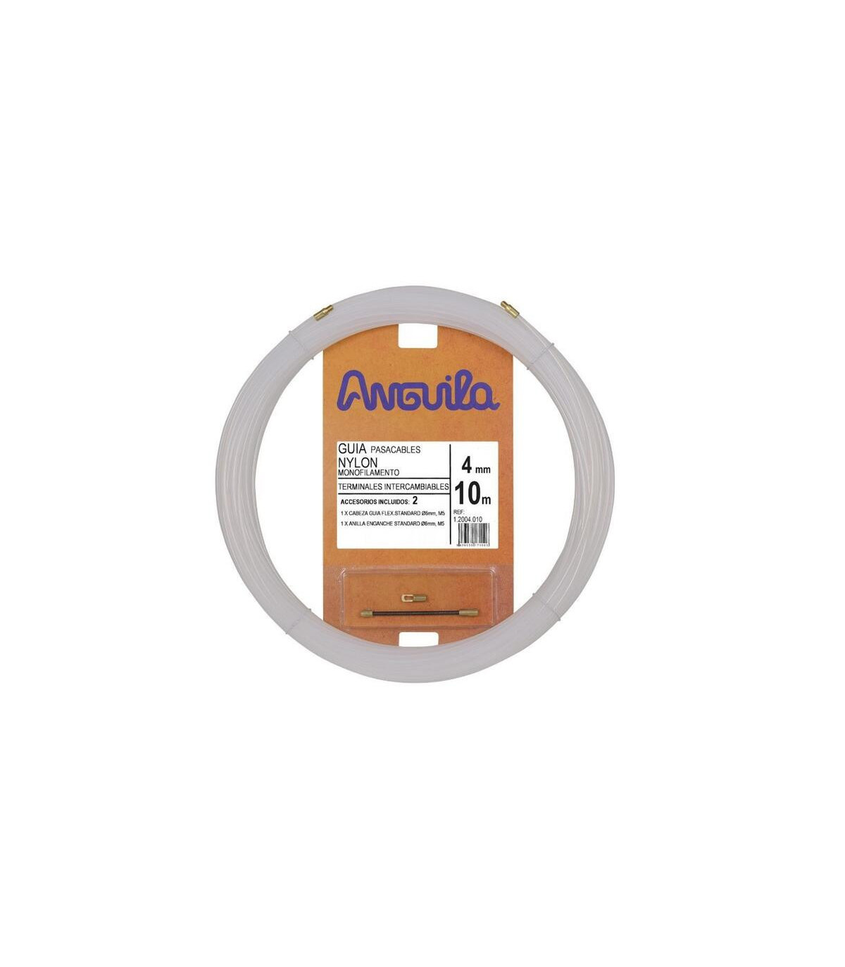 Le tire-câble Anguila 4 mm x 10 m en nylon naturel monofilament est équipé d'embouts interchangeables, d'une tête de guidage flexible de 6 mm et d'un anneau de traction fixe de 6 mm. Le nylon possède un fort effet mémoire, ce qui augmente les points de friction et induit un mouvement spiralé unique. Ceci réduit la force de traction et le rend inadapté aux distances supérieures à 20 ou 25 mètres. Le tire-câble Anguila 4 mm x 10 m en nylon naturel est conçu pour guider et protéger les câbles électriques dans les installations domestiques et industrielles. Fabriqué en nylon de haute qualité, il offre flexibilité, résistance à l'usure et durabilité, assurant un passage sécurisé des câbles dans les conduits et prévenant les dommages dus aux frottements ou aux torsions. Avec une longueur de 10 mètres et un diamètre de 4 mm, ce tire-câble est idéal pour les installations exigeant organisation et sécurité.