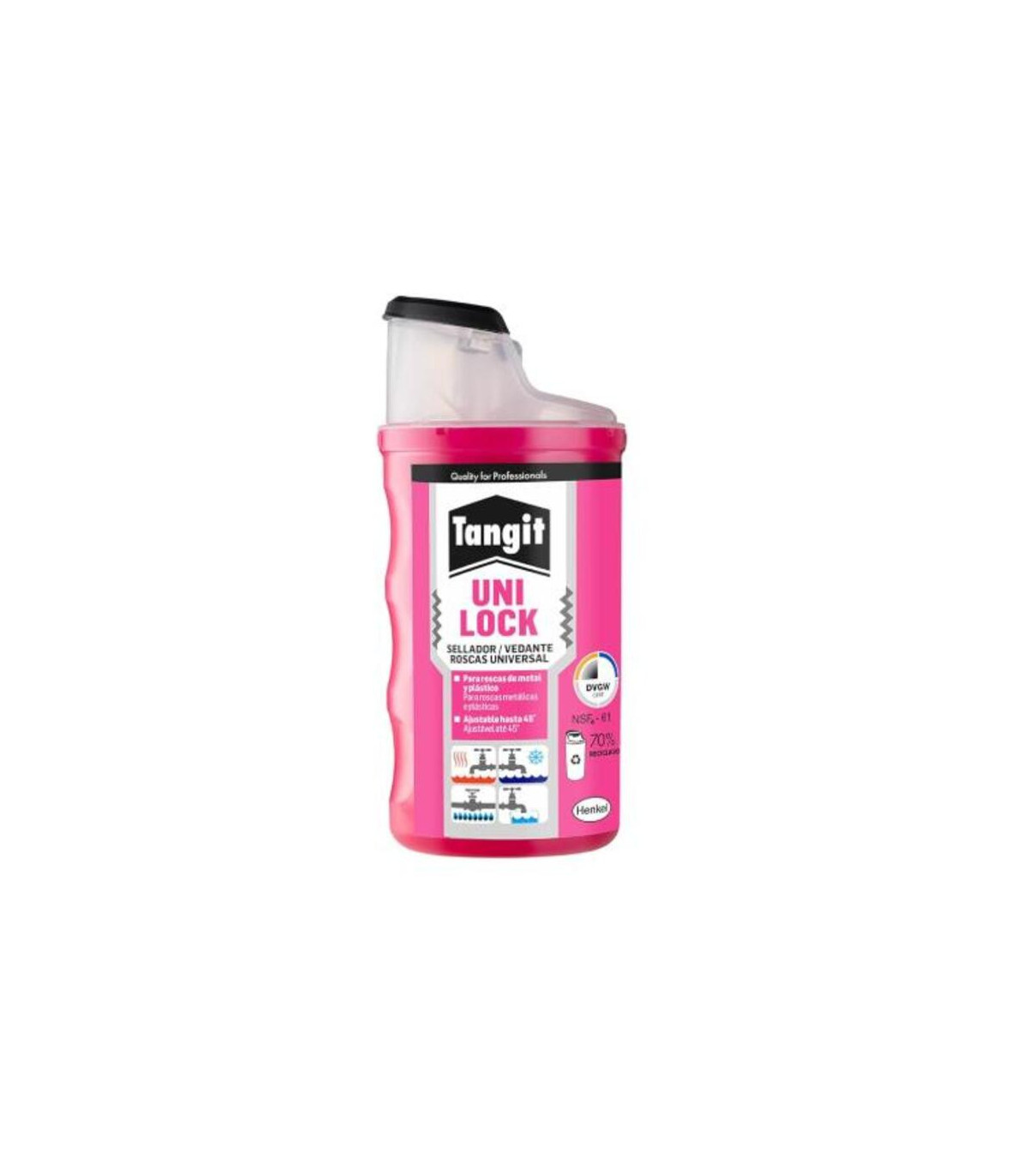 L'adhésif Tangit Uni-Lock, en flacon de 160 ml, est un mastic universel pour tous types de filetages, idéal pour réaliser des joints étanches entre tuyaux filetés en plastique et/ou en métal. Il remplace avantageusement le ruban Téflon ou le ruban de chanvre, garantissant une étanchéité parfaite entre les filetages. L'adhésif PVC Tangit Uni-Lock de Henkel, en flacon de 160 ml (référence 2959378), est une colle spéciale pour l'assemblage de tuyaux et raccords en PVC rigide. Sa formule haute résistance assure une liaison chimique sûre et durable, idéale pour les installations d'eau sous pression, les systèmes de drainage et les réseaux de tuyauterie.