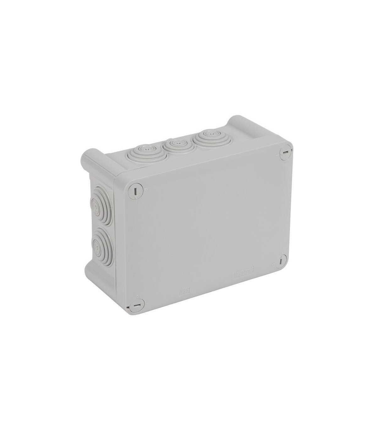 Boîte Plexo 155 x 110 x 74 mm. Boîtes de classe II - Gris RAL 7035 - 155 x 110 x 74 mm - 2 entrées (Réf. 0 919 14) + 8 entrées (Réf. 0 919 15) - Diamètres de câbles et conduits acceptés : 4 à 25 mm. Boîtes étanches Plexo IP 55 - IK 07 - Auto-extinguibles à 750 °C (EN 60695 2-10) - Température de fonctionnement : -25 °C à +40 °C - Entrée de câble ou de conduit par membrane flexible, entrée directe - Fermeture par quart de tour. - Indicateur de position ouvert/fermé (E/S) - Fixation murale : - Par 2 ou 4 points internes avec vis Ø 5 mm max. - Par les 4 coins (hors zone de câblage) - Par pieds de fixation, réf. 0 358 02 - Couvercle opaque. Le boîtier Plexo 155 x 110 x 74 mm, référence 092166, de Legrand, est une solution robuste et polyvalente pour les installations électriques intérieures et extérieures. Fabriqué avec des matériaux résistants, ce boîtier étanche offre une protection contre la poussière et l'humidité, garantissant ainsi la sécurité et la durabilité des connexions électriques.