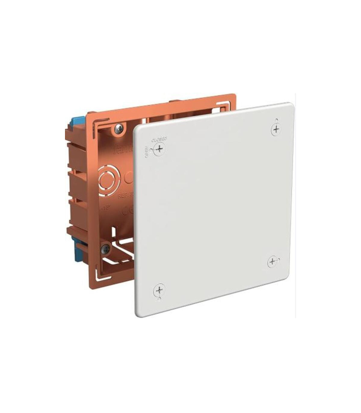 Boîte de dérivation encastrée pour cloisons creuses avec couvercle et supports de fixation métalliques. Dimensions : 100 x 100 x 45 mm. Indice de protection IP30, résistance aux chocs IK07, stabilité dimensionnelle de -25 °C à +85 °C, test au fil incandescent à 850 °C. Conforme à la norme EN 60670-22. Ces boîtes de dérivation encastrées pour cloisons creuses sont fabriquées en thermoplastique haute résistance. Elles sont conçues pour les circuits de dérivation principaux et secondaires dans les secteurs résidentiel, industriel et commercial. Toutes les boîtes sont dotées d'orifices d'ouverture facile pour une installation rapide. Elles comprennent des supports de fixation à dégagement rapide qui assurent une fixation sécurisée dans la cloison creuse. La boîte de dérivation carrée Famatel 3251 de 100 x 100 mm pour cloisons creuses est conçue pour loger des composants électriques, tels que des prises, des interrupteurs ou des connecteurs, dans des plaques de plâtre ou autres cloisons creuses. Sa structure offre un support sûr et stable, facilitant l'installation.