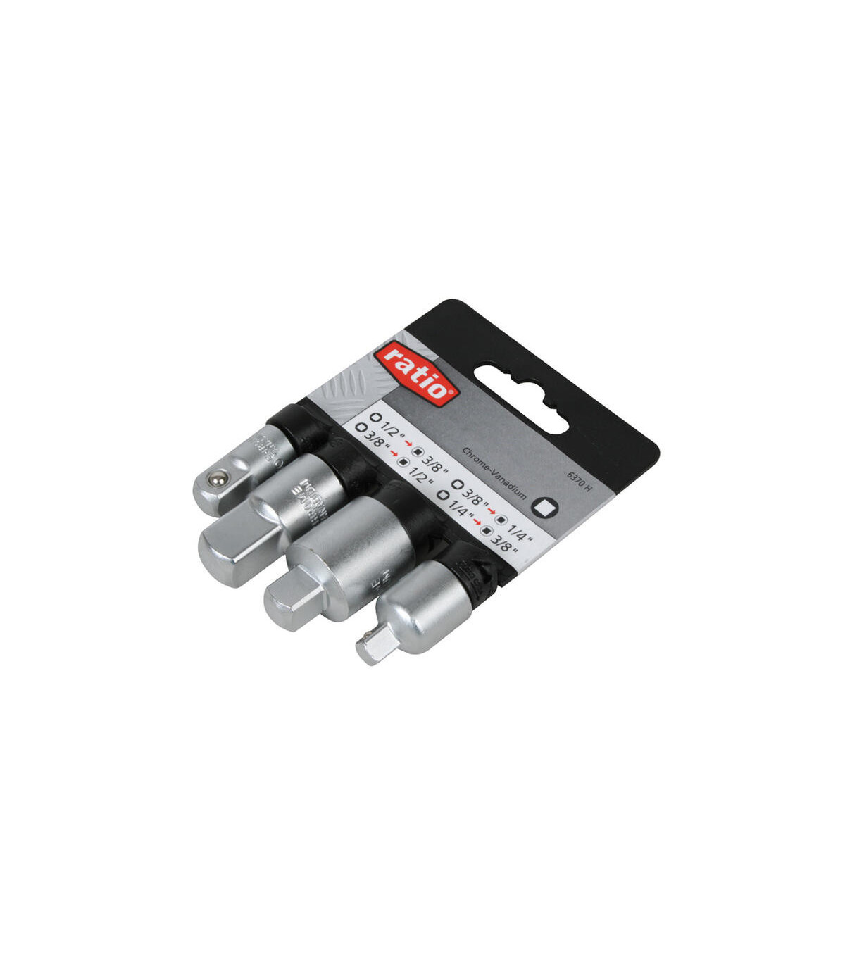 Réducteurs/rallonges de douilles 1/4" + 3/8" + 1/2". Acier au chrome-vanadium, finition satinée.
