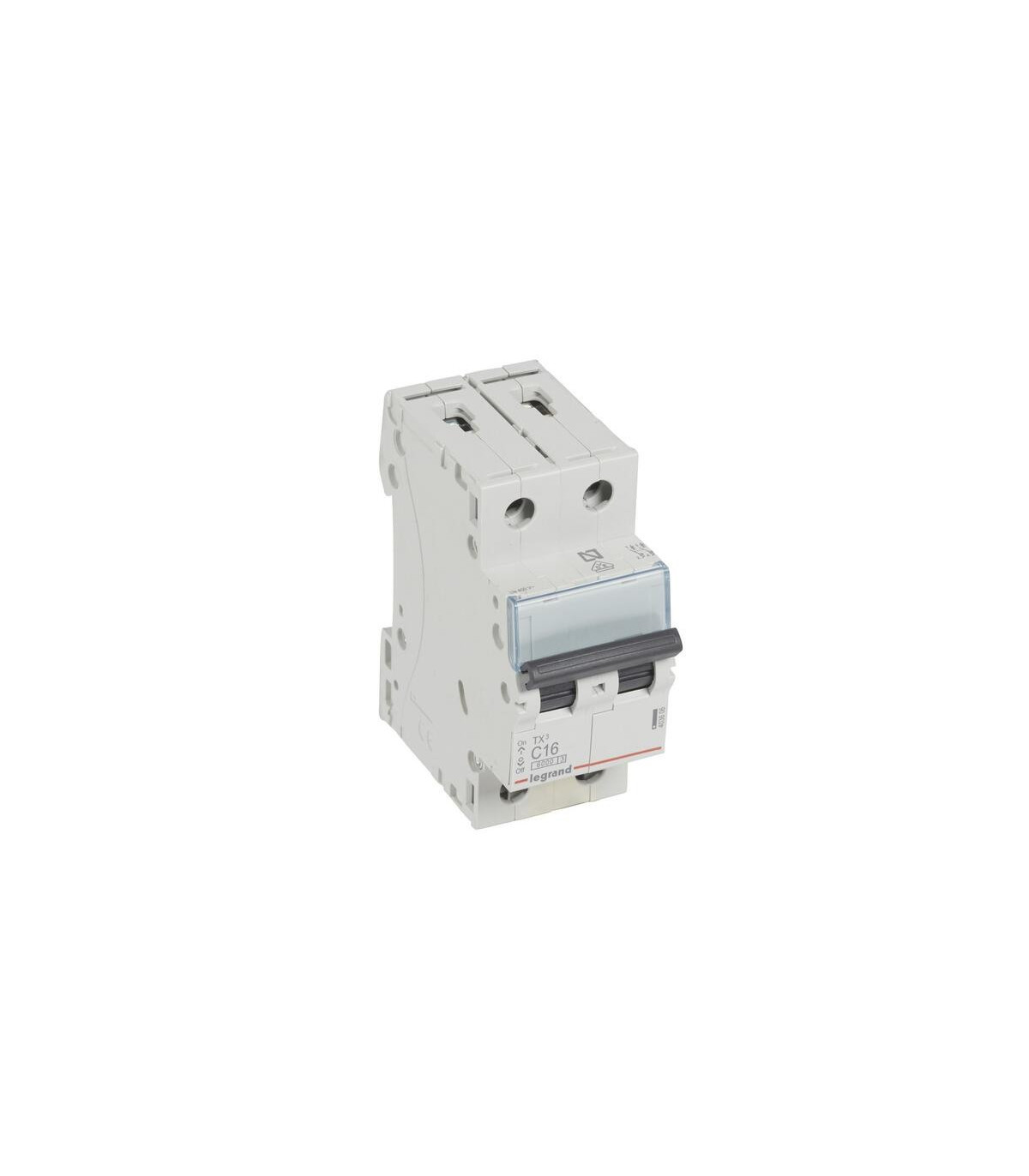 Disjoncteur bipolaire TX3 6KA-C 16 A. Disjoncteur bipolaire TX³ 230/400 V~ - Courbe C - Courant nominal : 16 A - Nombre de modules : 2. Disjoncteurs TX³ - Disjoncteurs de 6 A à 40 A - Courbe C - Pouvoir de coupure de 6 000 A - Conforme à la norme UNE EN 60898-1 - Connexion avec bornes protégées contre les contacts directs (IP20) - Vis imperdables - Porte-étiquette intégré - Capacité des bornes : 25 mm² souple / 35 mm² rigide - Peut être équipé de commandes motorisées et de dispositifs auxiliaires de commande et de signalisation DX³. Le disjoncteur Legrand TX3 2P C 16 A, d'un pouvoir de coupure de 6 kA, est conçu pour protéger les installations électriques contre les surcharges et les courts-circuits dans les circuits bipolaires. Sa technologie avancée garantit un déclenchement rapide et fiable en cas d'anomalie, protégeant ainsi les conducteurs et les équipements connectés, et assurant la sécurité et la continuité de l'alimentation électrique dans les environnements résidentiels, commerciaux ou industriels.