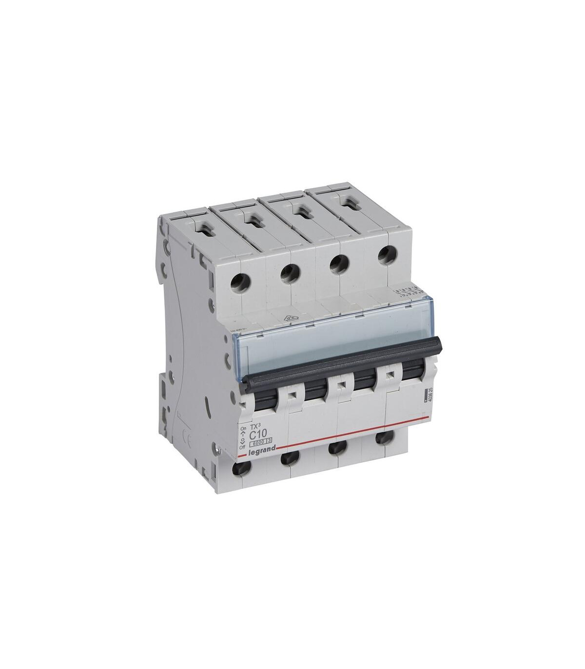 Disjoncteur TX3 6kA-C 4 pôles 10A. Disjoncteur TX³ quadripolaire 400 V~ - Courbe C - Courant nominal : 10 A - Nombre de modules : 4. Disjoncteurs TX³ - Disjoncteurs de 6 A à 40 A - Courbe C - Pouvoir de coupure de 6 000 A - Conforme à la norme UNE EN 60898-1 - Connexion avec bornes protégées contre les contacts directs (IP20) - Vis imperdables - Porte-étiquette intégré - Capacité des bornes : 25 mm² souple / 35 mm² rigide - Peut être équipé de commandes motorisées et d'unités auxiliaires de commande et de signalisation DX³. Le disjoncteur Legrand TX³ 6kA-C 4P 10A est un interrupteur automatique qui protège les installations électriques contre les surcharges et les courts-circuits. Sa technologie thermomagnétique garantit une réponse rapide et fiable à tout défaut électrique, assurant ainsi la sécurité des habitations, des bureaux et des installations industrielles. Avec un pouvoir de coupure de 6 kA, il offre un haut niveau de protection même dans les réseaux sujets aux surtensions.