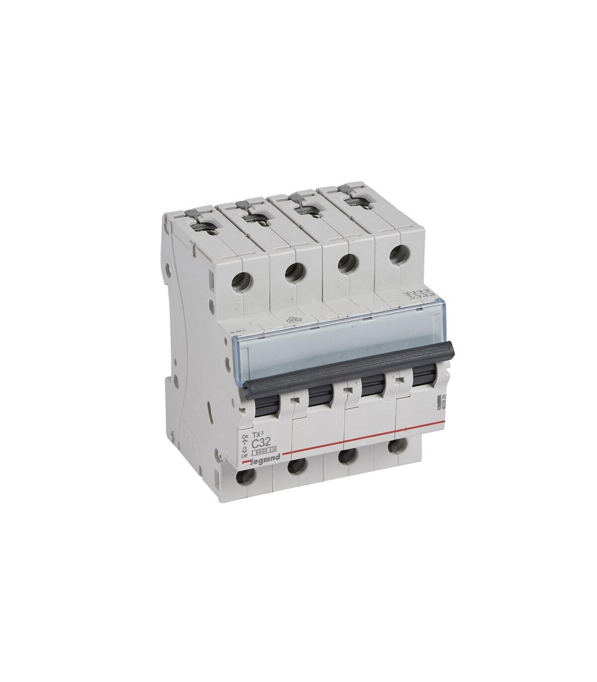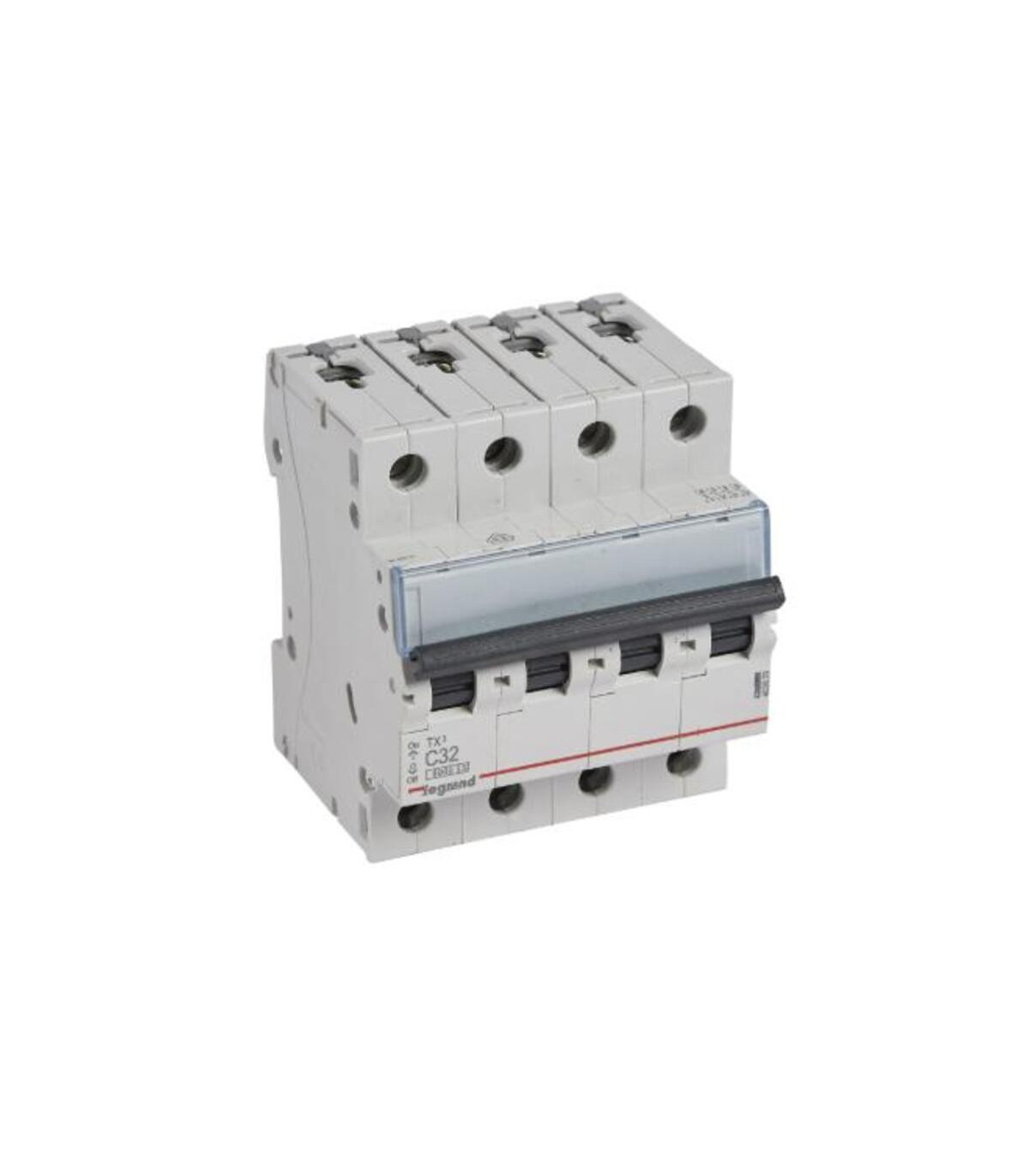 Disjoncteur TX3 6KA-C quadripolaire 32 A. Disjoncteur TX³ quadripolaire 400 V~ - Courbe en C - Courant nominal : 32 A - Nombre de modules : 4. Disjoncteurs TX³ - Disjoncteurs de 6 A à 40 A - Courbe en C - Pouvoir de coupure de 6 000 A - Conforme à la norme UNE EN 60898-1 - Connexion avec bornes protégées contre les contacts directs (IP20) - Vis imperdables - Porte-étiquette intégré - Capacité des bornes : 25 mm² souple / 35 mm² rigide - Peut être équipé de commandes motorisées et de dispositifs auxiliaires de commande et de signalisation DX³. La gamme de disjoncteurs TX³ de LEGRAND est conçue pour protéger les installations électriques contre les surcharges et les courts-circuits. Sa configuration quadripolaire (4P) la rend idéale pour les systèmes triphasés, offrant une protection complète sur chaque phase.