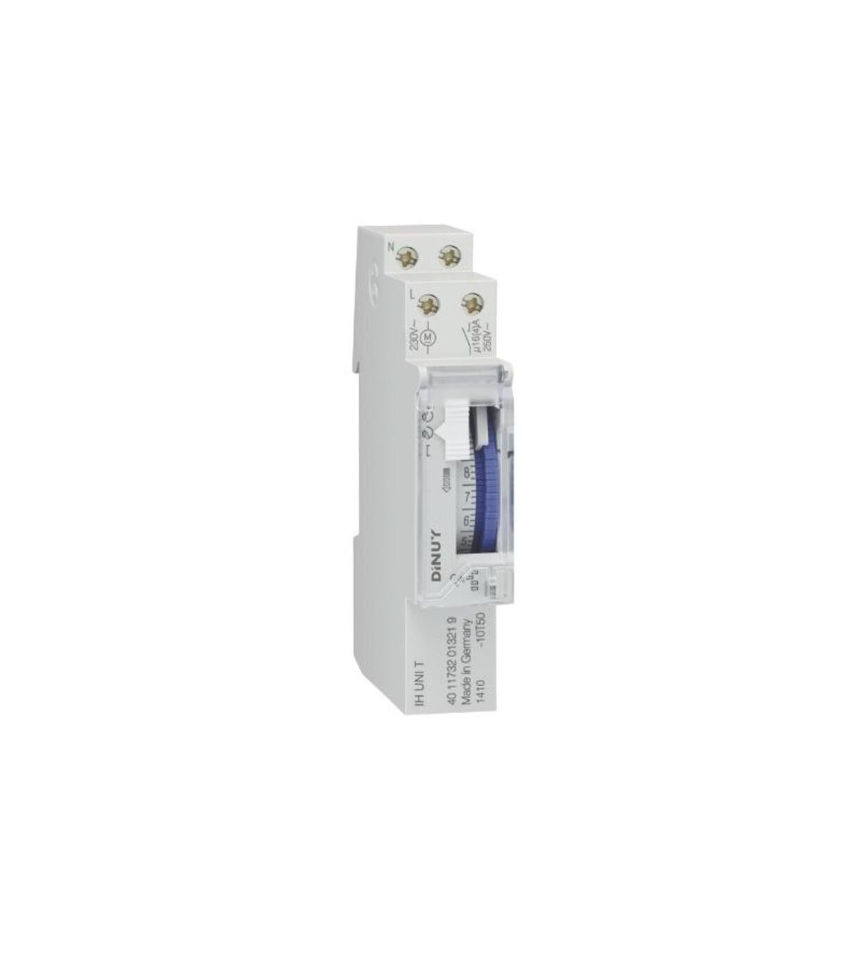 Un seul module. Interrupteur manuel : marche permanente ou automatique. Pas de réserve de puissance. Programmation simple grâce aux supports de montage intégrés. Lecture aisée des réglages programmés. Installation simple. Le Dinuy IH UNI T est un interrupteur horaire analogique monomodule pour montage sur rail DIN, conçu pour la régulation automatique des charges électriques par cycles de 24 heures. Fonctionnant sans réserve de puissance, il perd sa programmation en cas de coupure de courant.