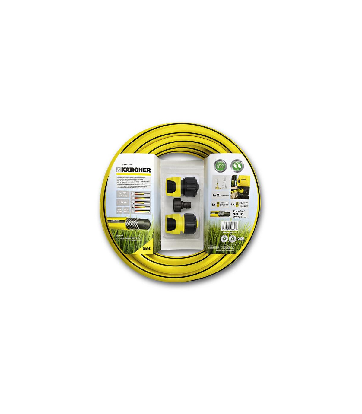 Produit temporairement indisponible. Nous vous contacterons pour confirmer la date de livraison. Ce kit de tuyau complet est conçu pour optimiser les performances des nettoyeurs haute pression Kärcher, offrant une solution polyvalente pour le nettoyage et l'arrosage du jardin. Il comprend un tuyau PrimoFlex® de 10 mètres (diamètre 3/4"), un raccord de robinet G3/4, un raccord de tuyau universel et un autre avec système Aqua Stop, permettant une déconnexion sans éclaboussures. Fabriqué sans phtalates (