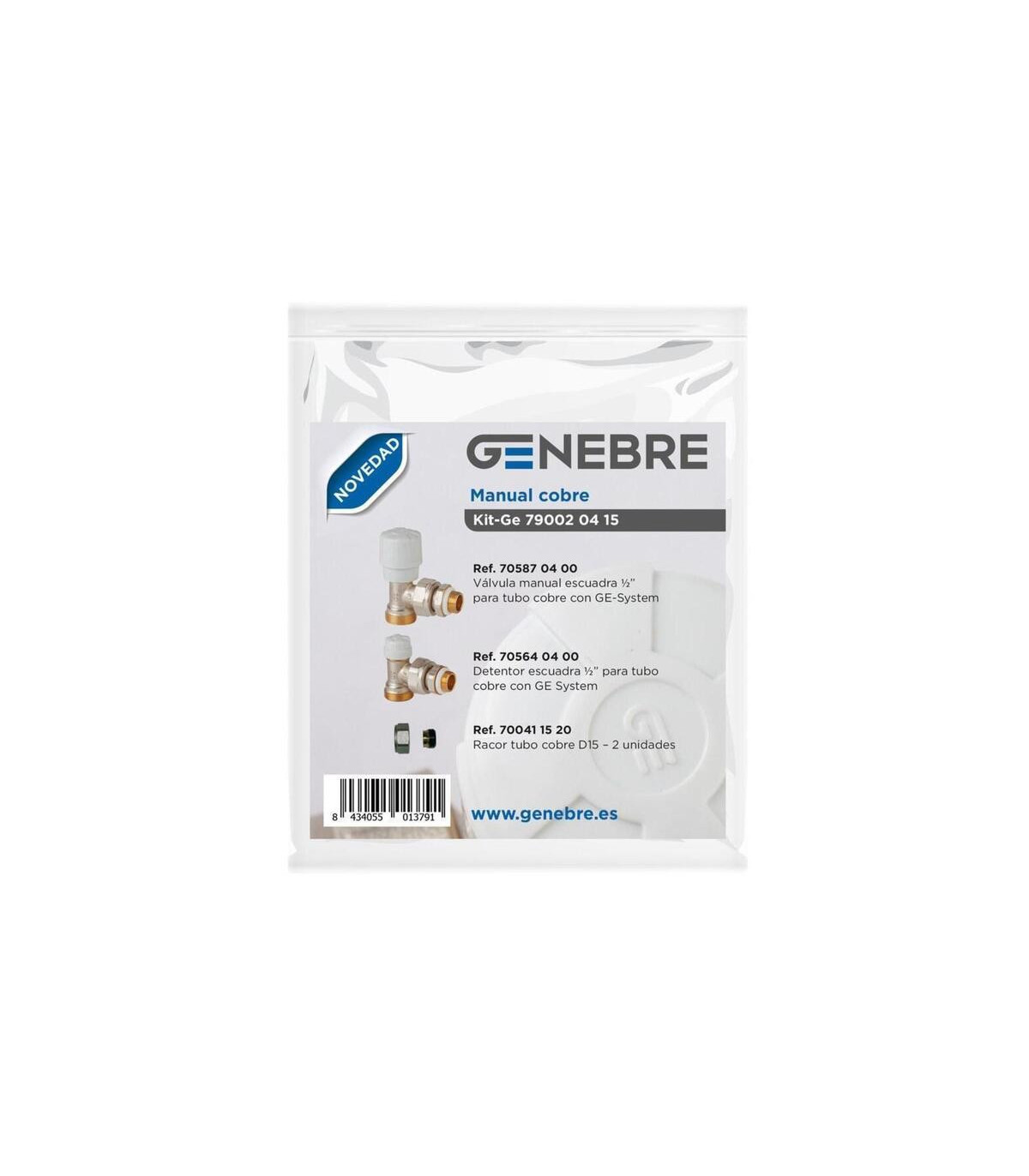 Le kit Genebre GE pour tuyauterie cuivre (réf. 79002 04 15) comprend un robinet d'angle manuel 1/2" pour tuyauterie cuivre avec système GE (réf. 705870400), un obturateur d'angle 1/2" pour tuyauterie cuivre avec système GE (réf. 705640400) et deux raccords D15 pour tuyauterie cuivre (réf. 700411520). Ce kit pour robinets manuels en cuivre intègre le système GE, un système d'étanchéité permettant une installation rapide et facile du raccordement robinet-tuyau. Le filetage du robinet est muni d'une bague PTFE pour une connexion étanche et rapide. Conçu pour faciliter l'installation, ce kit contient tout le nécessaire pour le montage d'un radiateur. Le kit Genebre pour tuyauterie cuivre GE, composé des modèles 705870400, 705640400 et 700701520, offre une solution complète et fiable pour les installations de plomberie et de chauffage utilisant des tuyaux en cuivre. Ce kit est conçu pour faciliter la création de connexions sûres et étanches.