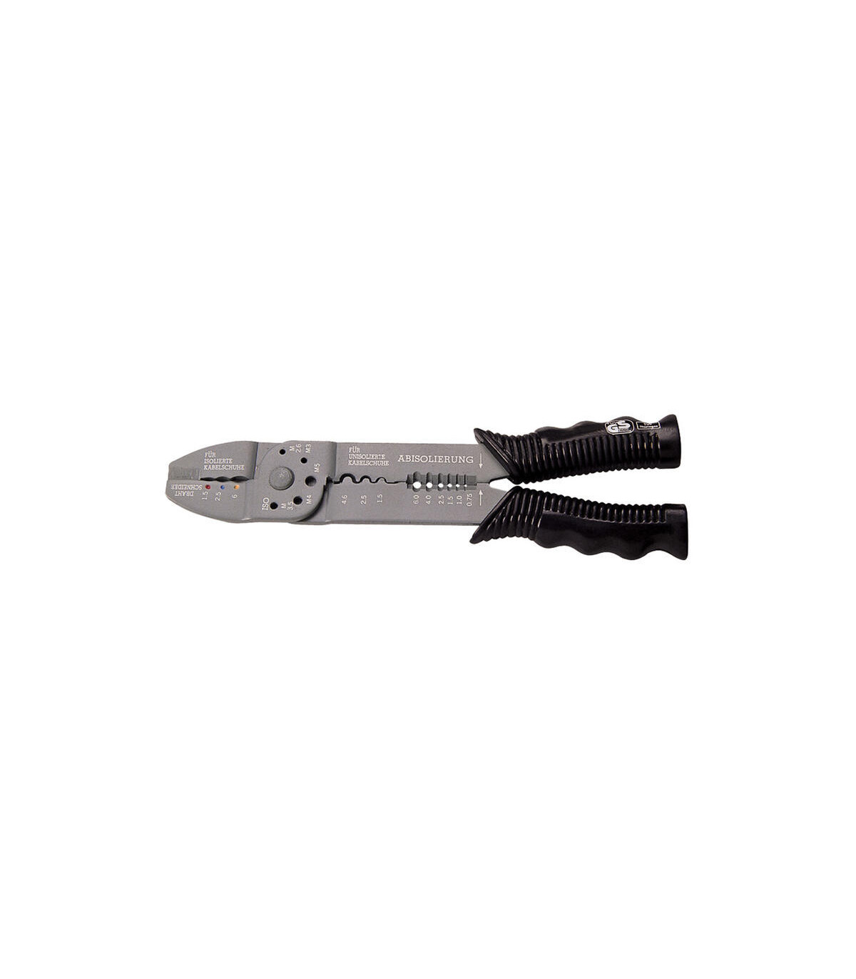 Cosses isolées (1,5-2,5-6), cosses non isolées (1,5-2,5-4,6), coupe-vis (M 2,6-3-3,5-4-5), pince à dénuder (0,75-1,0-1,5-2,5-4,0-6,0) et pince coupante. Poignée ergonomique.