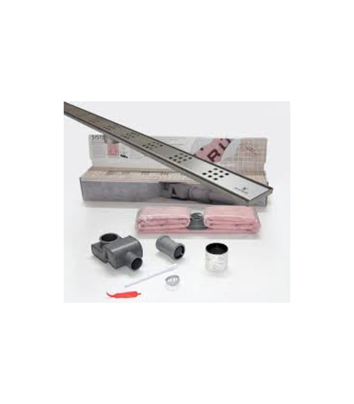 Canalisation de douche linéaire Evolux PLUS Contenu du kit : Caniveau en acier inoxydable de 1,5 mm d'épaisseur avec bac de récupération en acier inoxydable. Drainage linéaire pour pentes de 1 ou 2 mm. Disponible en 6 dimensions. - 1 siphon discret - 1 feuille de 4 m² de joint d'étanchéité - Accessoires d'installation