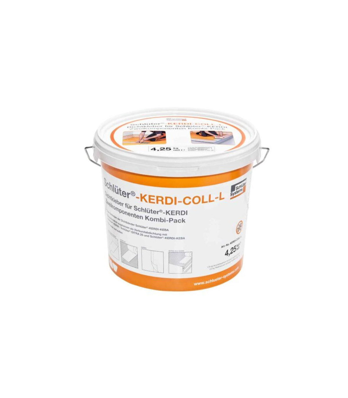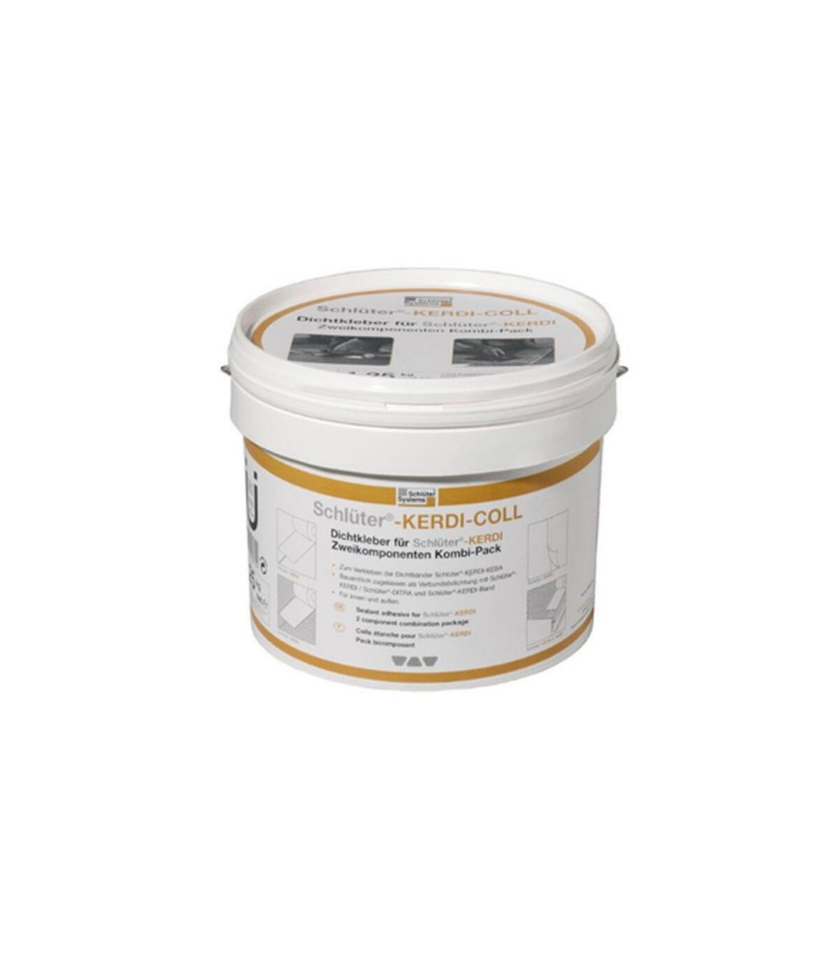 Adhésif bi-composant imperméable Kerdi-Coll de Schlüter Systems en bidons de 1,85 kg, finition grise. Kerdi-Coll est un adhésif bicomposant à base d'une dispersion acrylique sans solvant et d'une poudre réactive à base de ciment. Il convient au collage et à l'étanchéité des recouvrements de la membrane Kerdi. De plus, Kerdi-Coll peut être utilisé pour créer un joint étanche pour les bandes Schlüter-Kerdi-Keba au niveau des joints et des transitions de la membrane. Si le produit est utilisé avec une consistance souple, des pinceaux et des rouleaux adaptés peuvent être employés. Les matériaux appliqués doivent être collés rapidement (avant la formation du film) sans laisser d'interstices. Kerdi-Coll contient un ciment qui réagit de manière alcaline au contact de l'humidité.