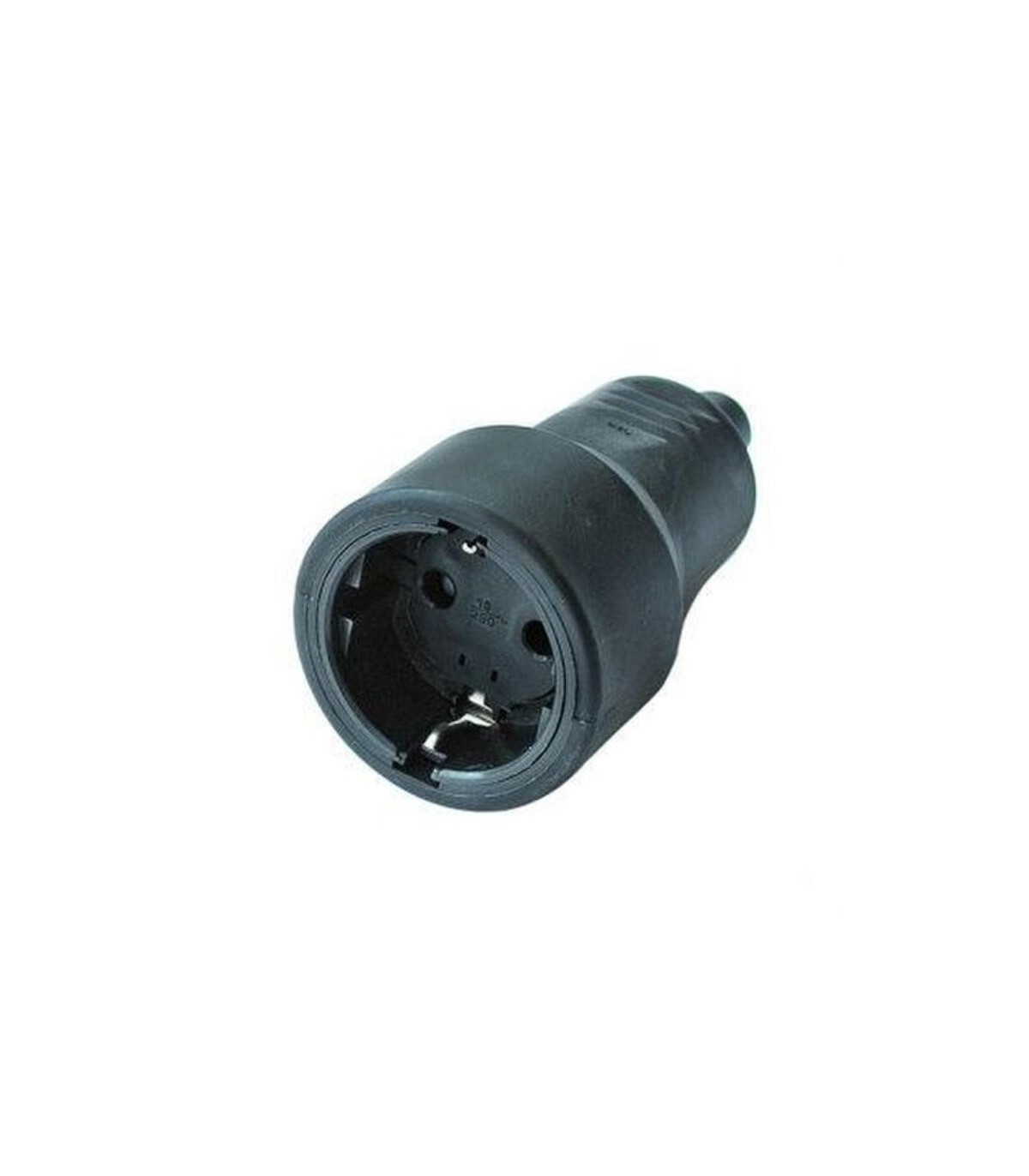 Prise mobile bipolaire en caoutchouc avec TT latéral. 16 A - 250 V. Noire. Emballée sous film rétractable.