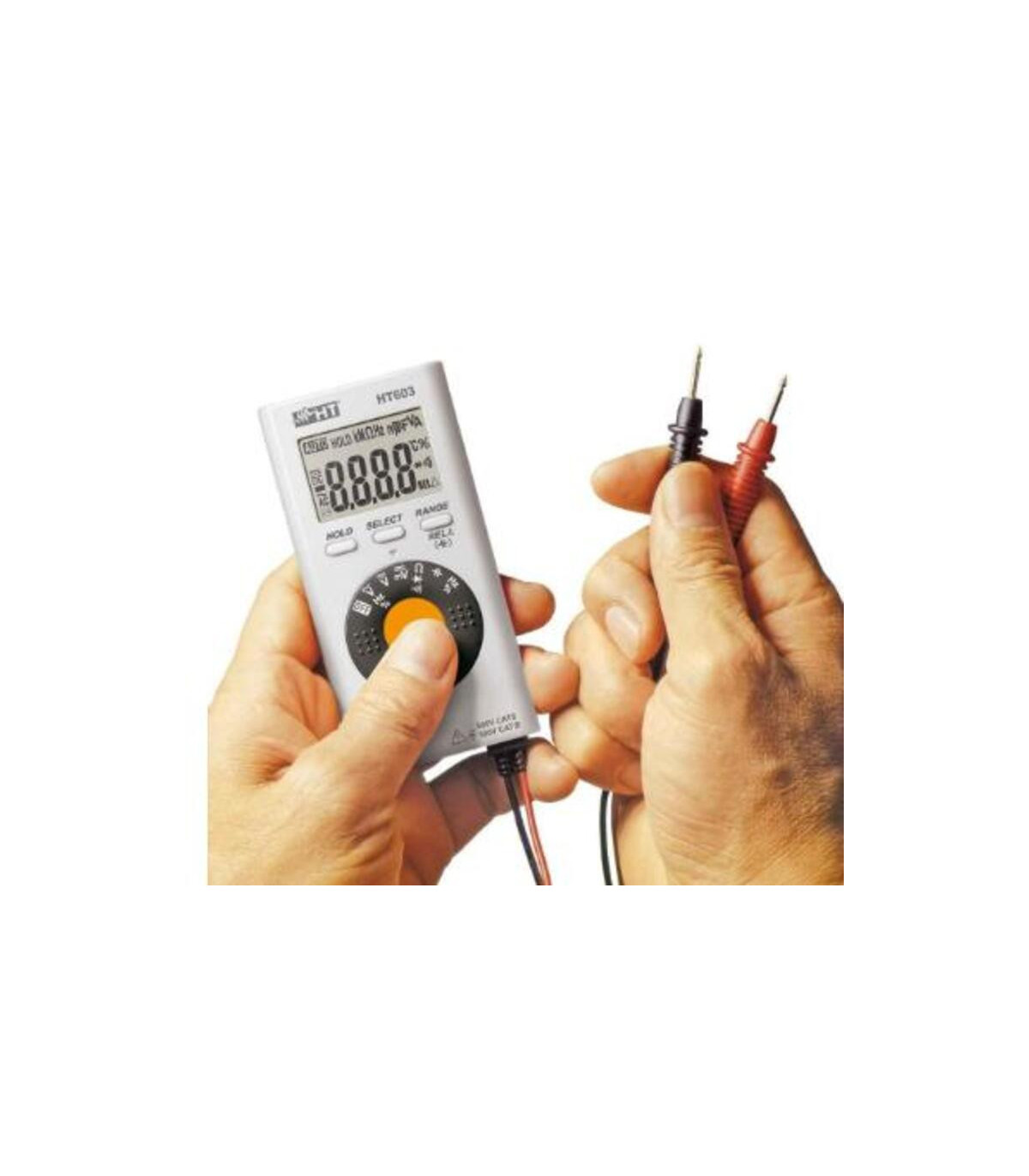 Multimètre numérique ultra-compact au design moderne et facile d'utilisation grâce à son étui de transport pratique et ses cordons de test intégrés. Cet instrument permet de mesurer la tension, la résistance, la continuité, la fréquence, le rapport cyclique, de tester les diodes et de mesurer la capacité. Le multimètre numérique de poche HT603 de HT-Instruments (référence 0656) est un outil compact et portable conçu pour la mesure précise des paramètres électriques de base. Il permet des lectures rapides et fiables de la tension, du courant et de la résistance, ce qui en fait un instrument pratique aussi bien pour les professionnels de l'électricité que pour les amateurs qui ont besoin de surveiller leurs installations et circuits. Son design ergonomique et léger facilite son transport et sa manipulation au quotidien, tandis que l'affichage numérique offre une lecture claire des résultats. Ce modèle intègre des fonctions de sécurité, telles qu'une protection contre les surcharges, et son boîtier robuste protège l'appareil.