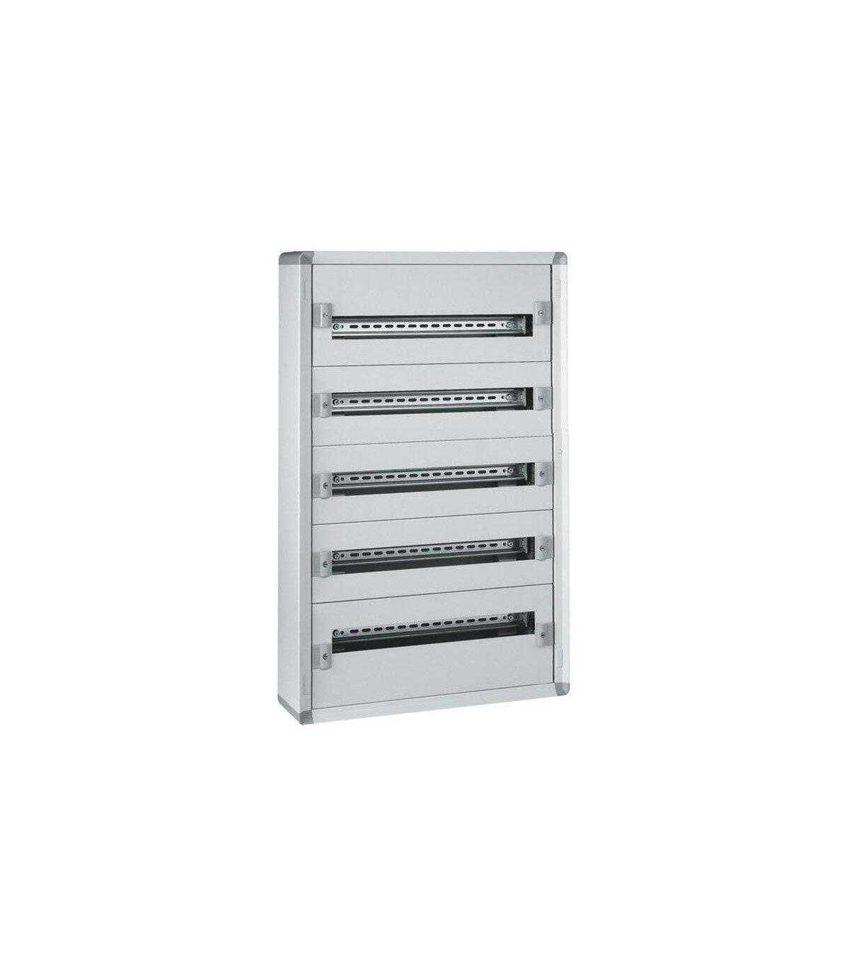 Boîte métallique XL³ 160 à montage en surface avec 5 rangées. Boîte de distribution métallique modulaire à montage en surface - Convient aux appareils modulaires DPX³ 160, Vistop 125A ou moins - Nombre de rangées : 5 - Nombre de modules : 120 - Hauteur : 900 mm - Largeur : 575 mm - Profondeur : 147 mm. XL³ 160 - Boîtes de distribution métalliques prêtes à l'emploi - Résistance au feu selon IEC 60695-2-11 : 750 °C - Châssis amovible avec profilés symétriques prémontés - Barre omnibus en laiton pour conducteurs de protection : 36 trous de 1,5 à 10 mm² et 2 trous de 35 mm² - Capacité : 24 modules par rangée - RAL 7035 - Livré complet avec profilés et plaques de recouvrement des bornes - Portes à commander séparément - Permet des assemblages certifiés selon UNE EN 61439-2 et -3 - IP 43 - IK 08 avec joint et porte, IP 40 - IK 08 avec porte, IP 30 - IK 07 sans porte - Panneaux latéraux amovibles. Parties supérieure et inférieure amovibles et divisibles pour l'insertion de la plaque presse-étoupe découpable (à commander séparément).