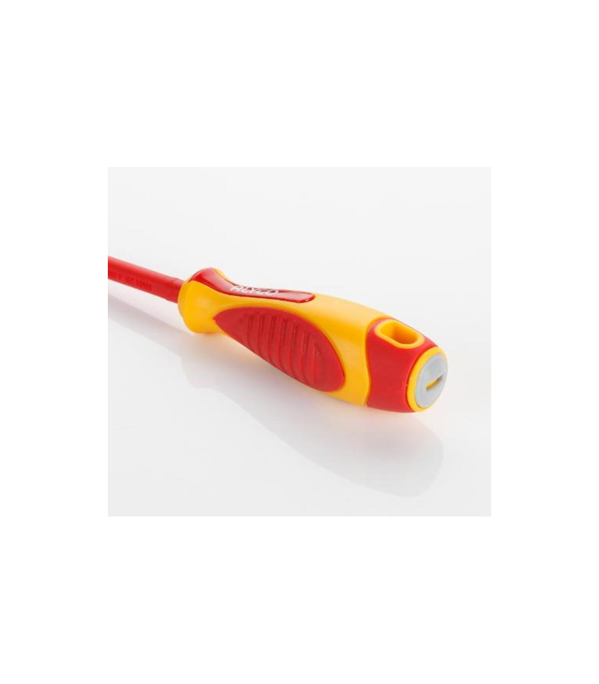 L'embout Pozidriv PZ2 est traité thermiquement et magnétisé, assurant une prise ferme sur la vis et évitant l'arrondissement de sa tête. La poignée ergonomique bimatière offre une excellente prise en main et une absorption optimale des efforts, idéale pour les tâches répétitives sans fatigue. Sa conception permet d'accéder aux espaces restreints grâce à l'isolation intégrée à la tige. Cet outil léger, durable et sûr est recommandé aux électriciens, aux techniciens de maintenance et aux professionnels de l'industrie.